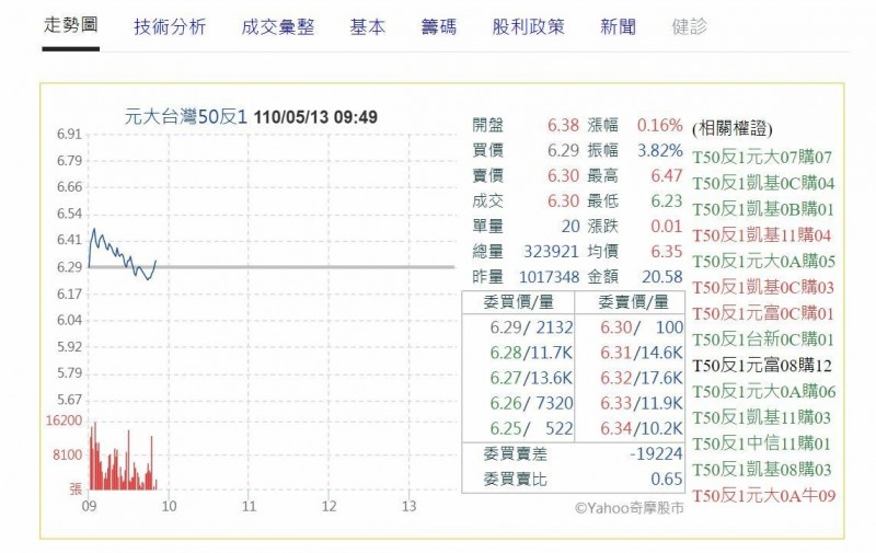急避險 元大台灣50反1今日成交量爆26 5萬張 自由財經